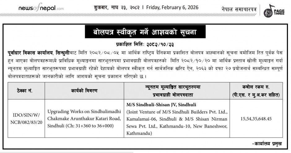 बोलपत्र स्वीकृत गर्ने आशयको सूचना