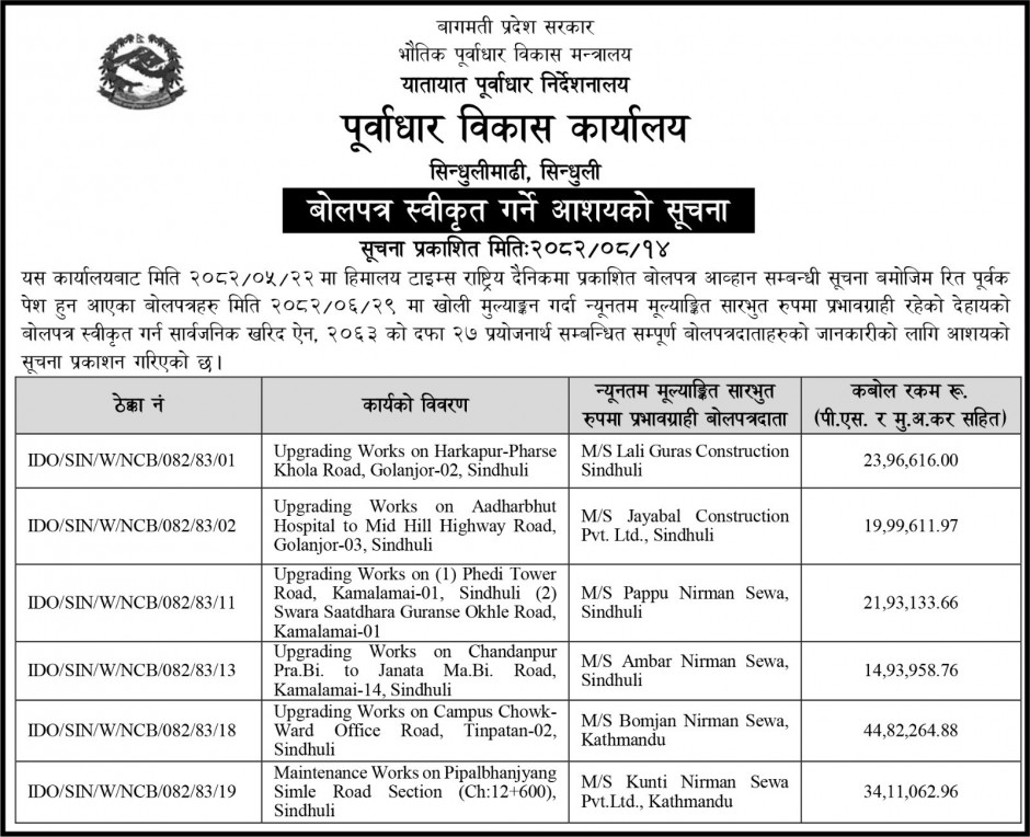 बोलपत्र स्वीकृत गर्ने आशयको सूचना