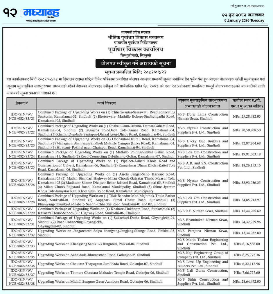 बोलपत्र स्वीकृत गर्ने आशयको सूचना