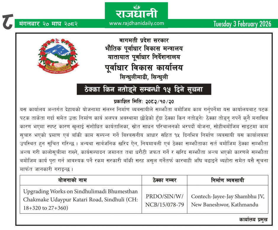 ठेक्का किन नतोड्ने सम्बन्धी १५ दिने सूचना